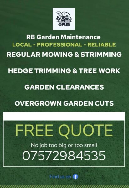Thank you to RB Garden Maintenance today for cutting my hedges before the nesting period – and in the rain! I shall be calling on you again because of your courteous and excellent work.