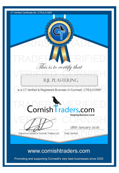 What sets RJL Plastering apart in the market is our unwavering dedication to providing an excellent finish at great value. We are proud to be verified with Cornish Traders, which reflects our commitment to high standards and trustworthiness. With a full coverage of Cornwall, we are your local experts, ready to bring our skills and attention to detail to your doorstep.
